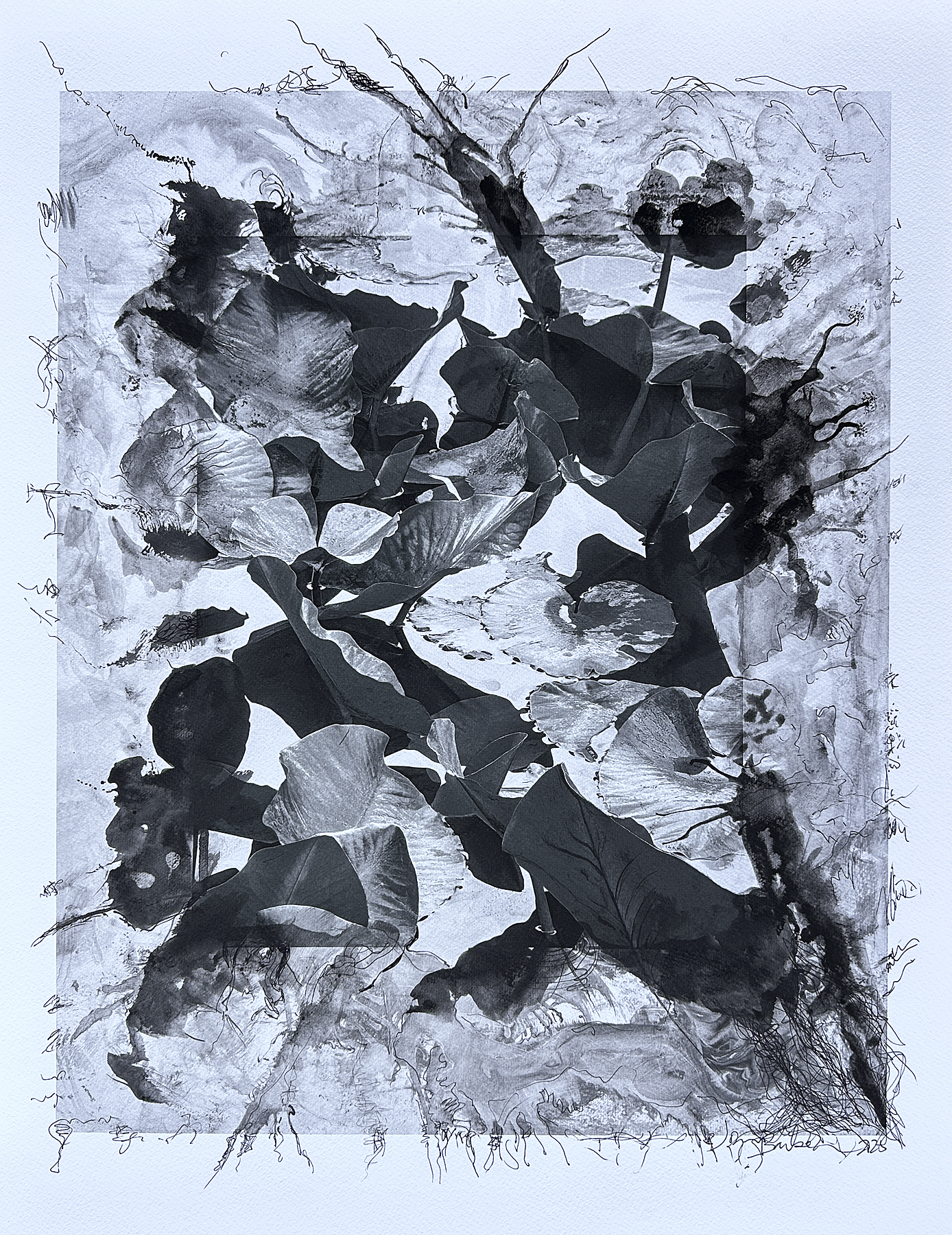 © Joan Barker, Leaves in Shadow, 2025, painting and photograph, 24″ x 20