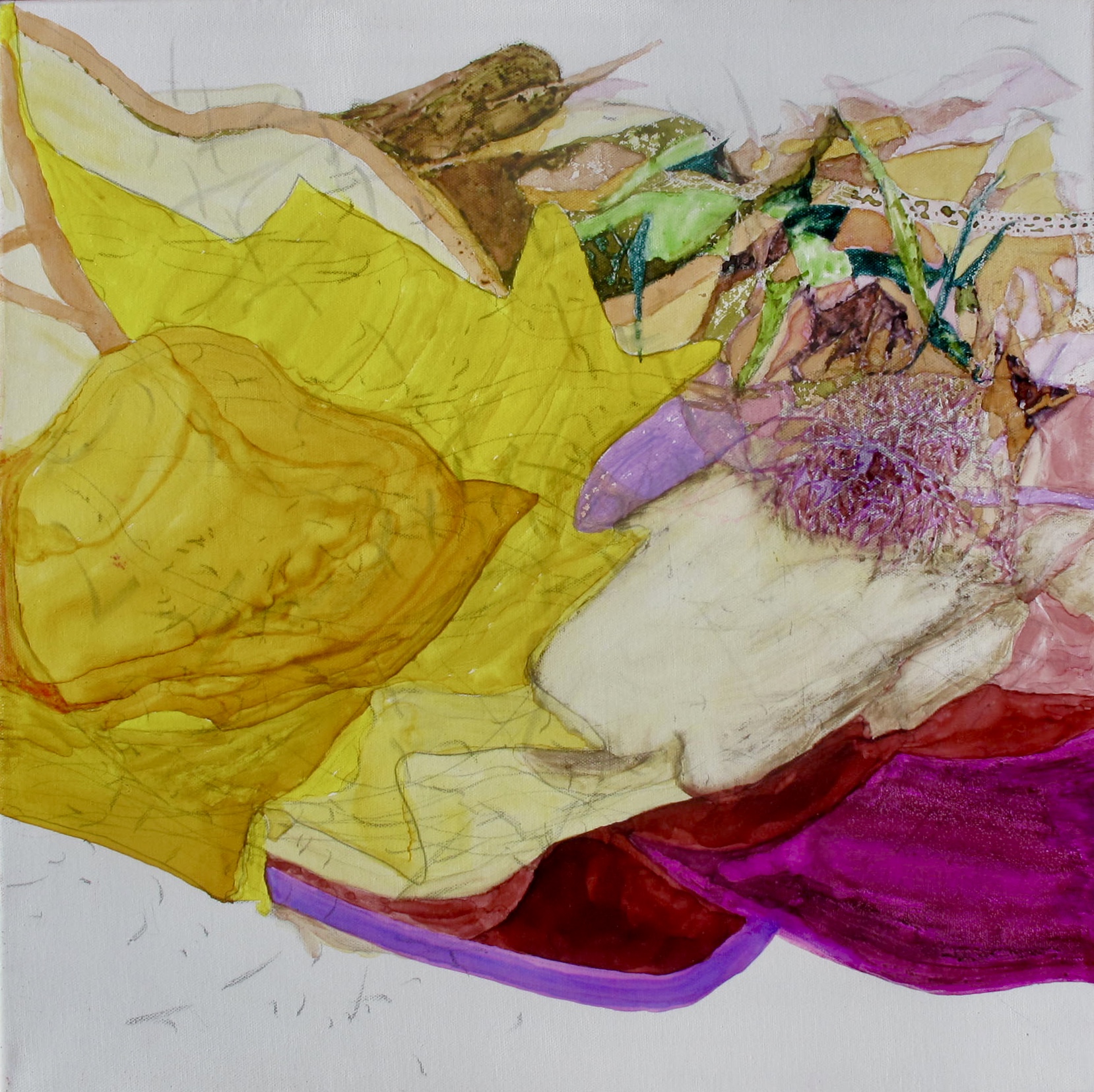© Harriet Livathinos, Nesting, 2024, graphite, ink, and watercolor on waxed canvas, 20″ x 20″ x 1″