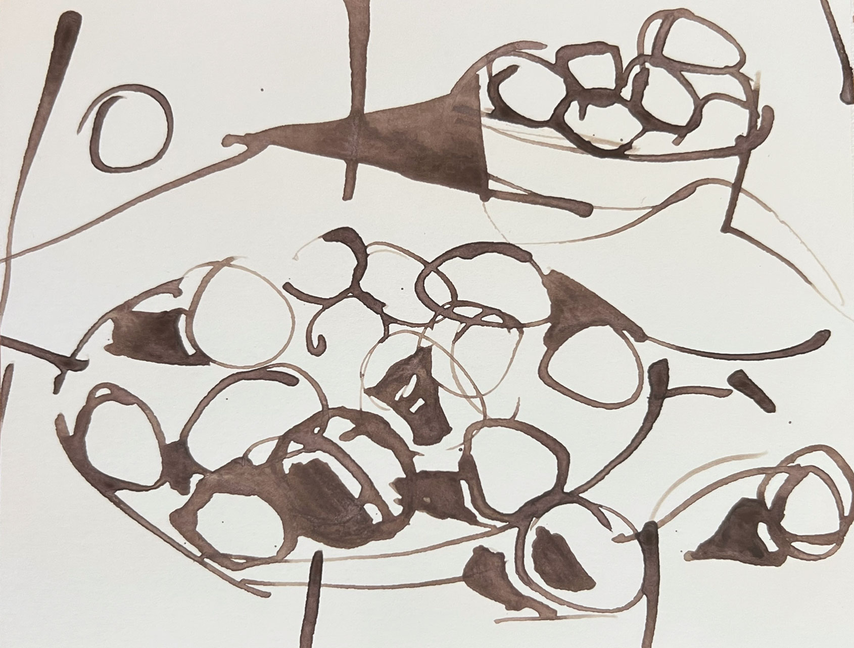 © Steven Rushefsky, CIRCLES (Bowl of Plums with Platter), 2022, reed pen and ink on paper, 5.5″ x 7″
